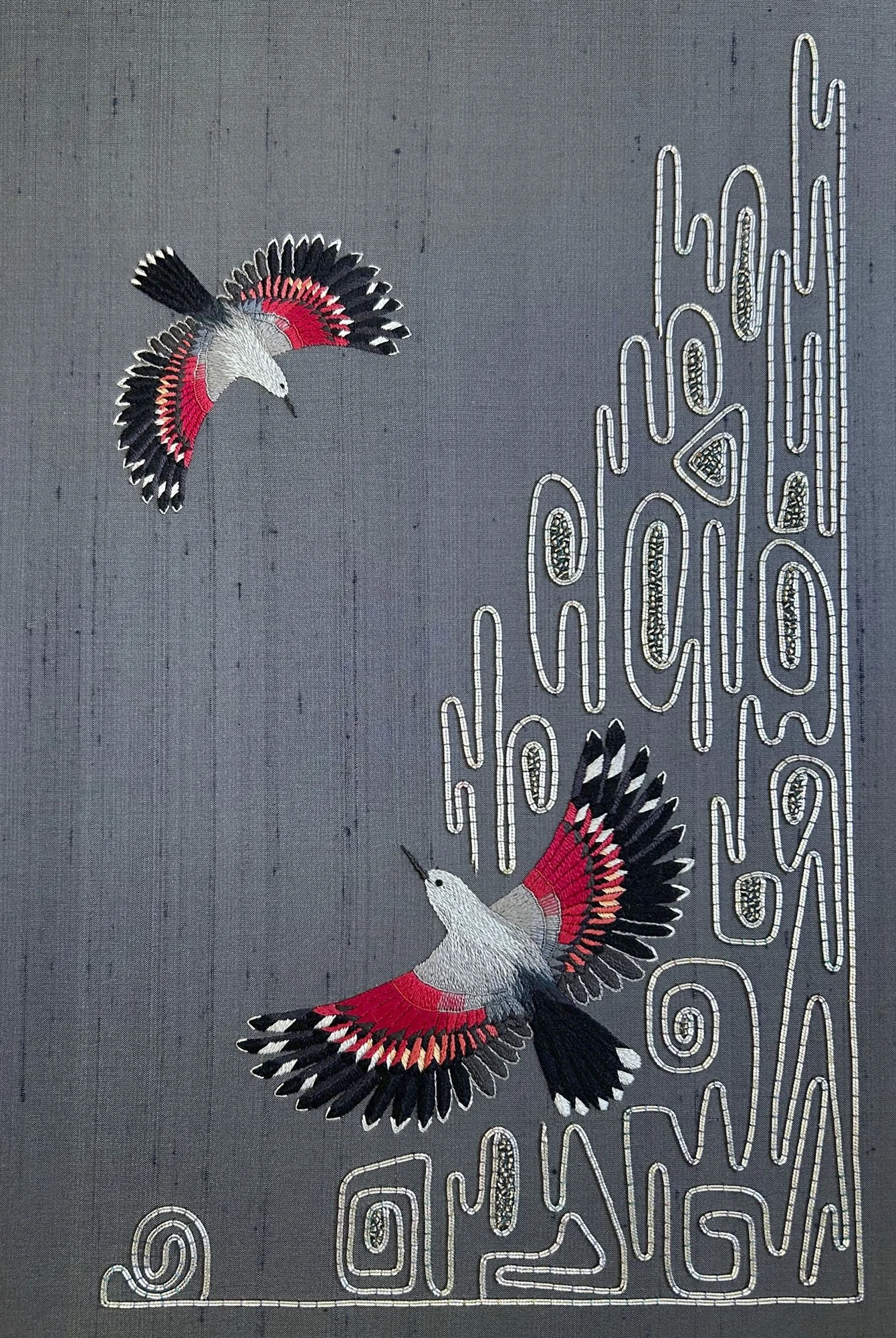The two birds are embroidered using stranded silks in shades of very dark blue, purple, grey and scarlet red with white highlights.